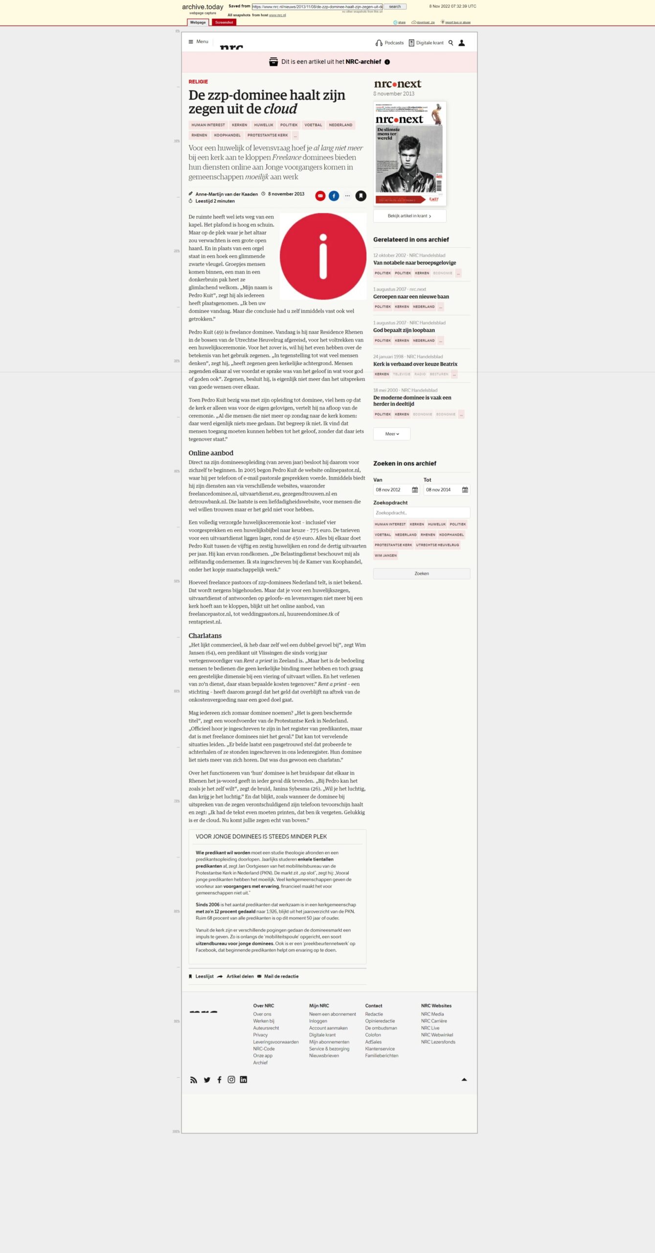 Wellicht herinneren jullie nog de ‘Buitenparlementaire Onderzoekscommissie BPOC2020 van het gevallen tweetal Pieter en Jade Kuijt. Zij lieten van zich horen tijdens de Coronacrisis. Onlangs kwam aan het licht dat het een plat verdienmodel was geweest; van donaties werd vorstelijk geleefd. Dat was voor Ds. (dat was hij) Pieter Kuijt niks nieuws, naar verdienmodellen zoeken. Ik kwam na wat zoekwerk het volgende tegen in het archief van NRC. Dominee op bestelling. “De zzp-dominee haalt zijn zegen uit de cloud” https://archive.vn/GVQyq